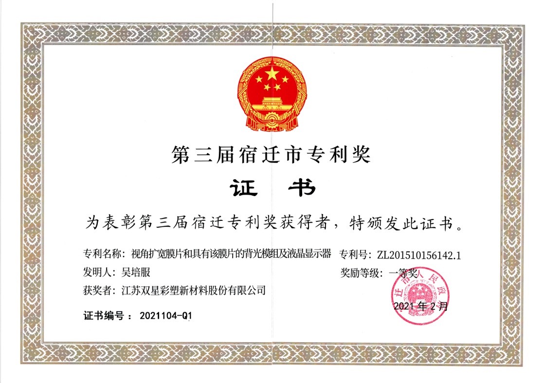 On May 7, 2021, the city accelerated the high-quality development of industrial economy and the investment attraction conference, commended the winners of the third Suqian Patent Award, and the patent project of "angle widening diaphragm and backlight module and LCD with this diaphragm" declared by the company won the first prize.
