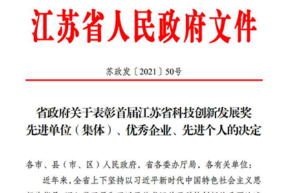 Recently, the selection list of the first Jiangsu Science and Technology Innovation Development Award was released, and the company was awarded the "Outstanding Enterprise of Jiangsu Science and Technology Innovation Development Award".