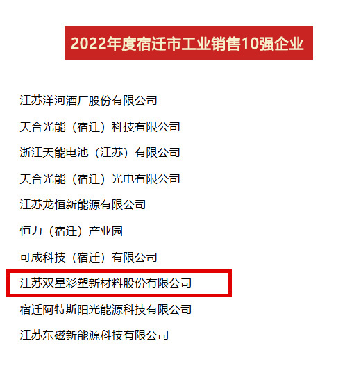 2023年4月7日,全市開發區高質量發展暨工業經濟年度表彰大會召開,公布了2022年度“宿遷市工業貢獻10強、工業投資10強、工業銷售10強”名單,雙星新材喜獲“貢獻10強位列第4位、投資10強位列第6位、銷售10強位列第8位”。